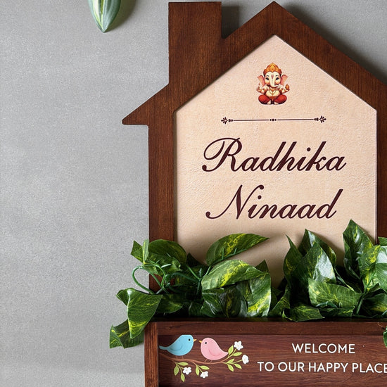 Crafted in a delightful house silhouette, the nameplate features customizable background colors and printed names, paired with an optional divine motif (like Lord Ganesha or any artwork of your choice) for a personalized spiritual touch. The integrated planter base adds vibrance with artificial foliage, a maintenance-free way to infuse nature into your space.