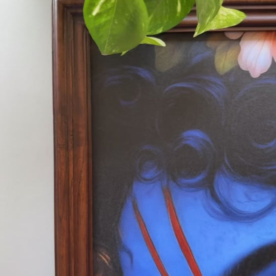This stunning 22 x 32 inch spiritual wall art portrays Krishna in serene stillness, gently embracing a calf, symbolizing protection, purity, and boundless love. The rich blue tones of Shyam contrast beautifully with warm floral accents, creating a visually powerful yet calming presence. Every detail in this artwork has been mindfully designed to radiate peace, devotion, and emotional warmth.