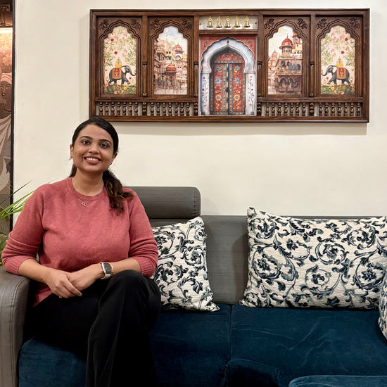 Inspired by the architectural elegance of Rajasthani palaces, Meera Mahal pays homage to a time when art lived in every doorway, every jaali, every chime of a temple bell. Designed to evoke the nostalgia of royal corridors and haveli balconies, it is grand, rooted, and timeless - a statement piece that instantly transforms a wall into a work of art.