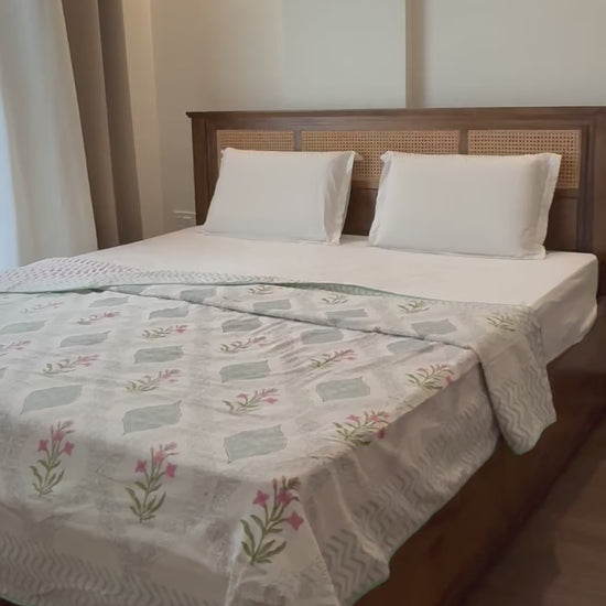 A name that feels like poetry, Mehzica is where delicate florals meet regal design. This reversible AC dohar is hand block printed on soft mulmul cotton, featuring elegant Mughal-inspired motifs on one side and a cheerful mix of chevrons and florals on the reverse. Finished with a turquoise piping, Mehzica blends charm with craftsmanship in every thread.