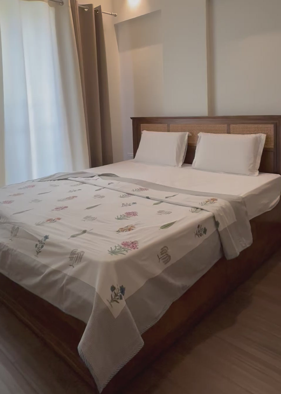There are some pieces that don’t just decorate your space, they bring a sense of calm to it. Ruhani is one of them. Crafted from the softest mulmul cotton and hand block printed by skilled artisans, this reversible AC dohar features a serene dance of trees and florals on one side and a delicate striped pattern on the other.