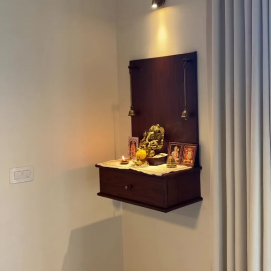 - Design: Wall-mounted, comes in 3 parts – back panel, drawer unit, and Ganesha platform