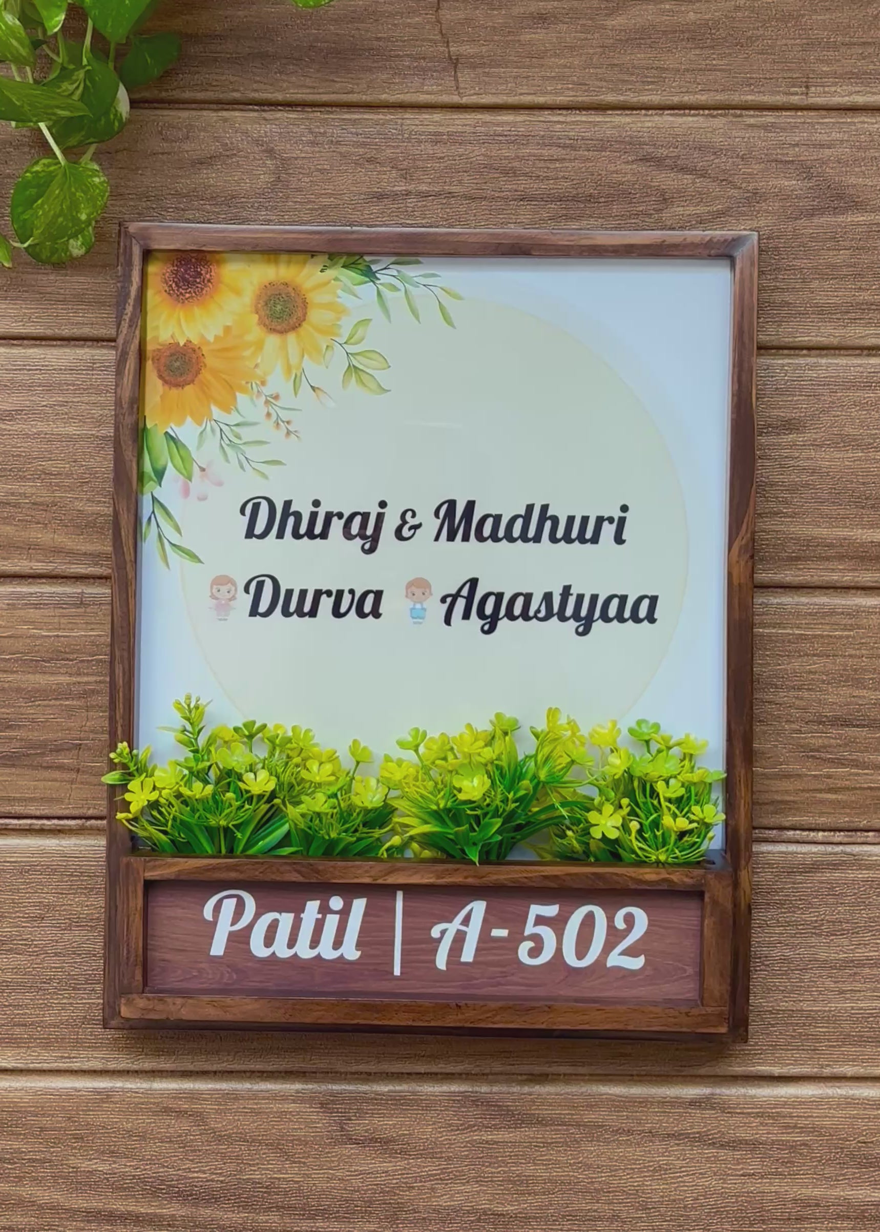 The Sunshine to My Home Planter Nameplate brings warmth, brightness, and a touch of nature-inspired charm to your entrance. Adorned with vibrant sunflowers and set in a soft, welcoming palette, this vertical nameplate radiates positivity. The lush artificial plants at the base add a pop of greenery, making it a delightful and cheerful decor piece for any home. It’s the perfect fusion of style and sentiment — making your guests feel welcome before they even step inside.